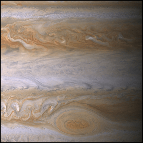 The fifth planet from the Sun, Jupiter has swirling clouds, huge storms, and colorful bands of gas.