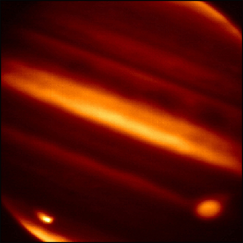 The fifth planet from the Sun, Jupiter’s atmosphere contains bands of gas, that stand out in this infrared image.