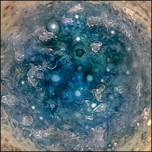 Stylized image of the swirling storms at the planet Jupiter’s south pole.