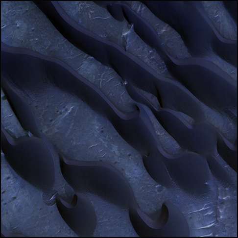 Stylized false-color image of dunes on the surface of the planet Mars.
