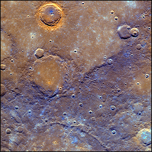 The first planet from the Sun, Mercury has highlands (purple), cliffs, lava plains (tan), and craters.